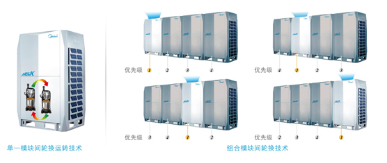 系統(tǒng)根據(jù)系統(tǒng)負(fù)荷情況,輪換設(shè)置優(yōu)先開啟的室外機(jī)模塊的壓縮機(jī)順序,平衡分配每臺(tái)室外機(jī)模塊的運(yùn)行時(shí)間,大大提高了機(jī)組的可靠性和使用壽命。